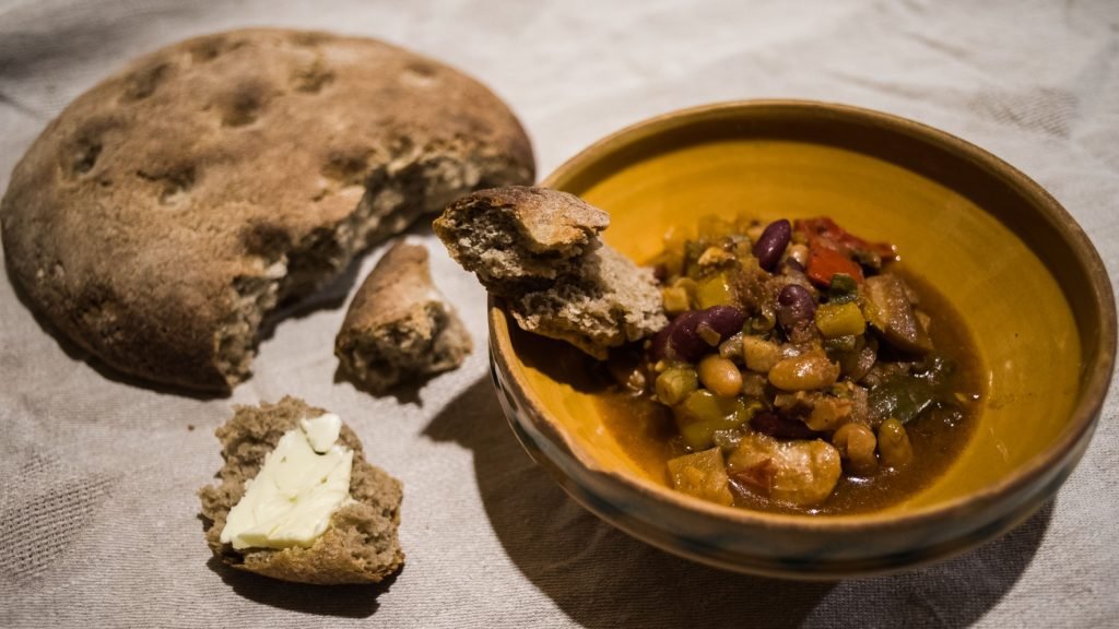 Miežiniai miltai yra neblogas daiktas, jie kepiniams ar naminiams makaronams suteikia ypatingą, stiprų skonį. Tačiau vien iš jų duonos neiškepsi. Galima kepti kietus papločius, bet puri duona niekaip nesigaus. Jei norite iškepti gražų kepaliuką, teks naudoti maždaug trečdalį miežinių, o likusius kvietinius miltus. Aš kepiau „pusinę“ duoną – per pusę miežinių ir kvietinių miltų, ir formavau paplotį. Man patinka laužomos duonos, ypač prie troškinio, tada labai patogu išdažyti likusį padažą kietesne plutele.