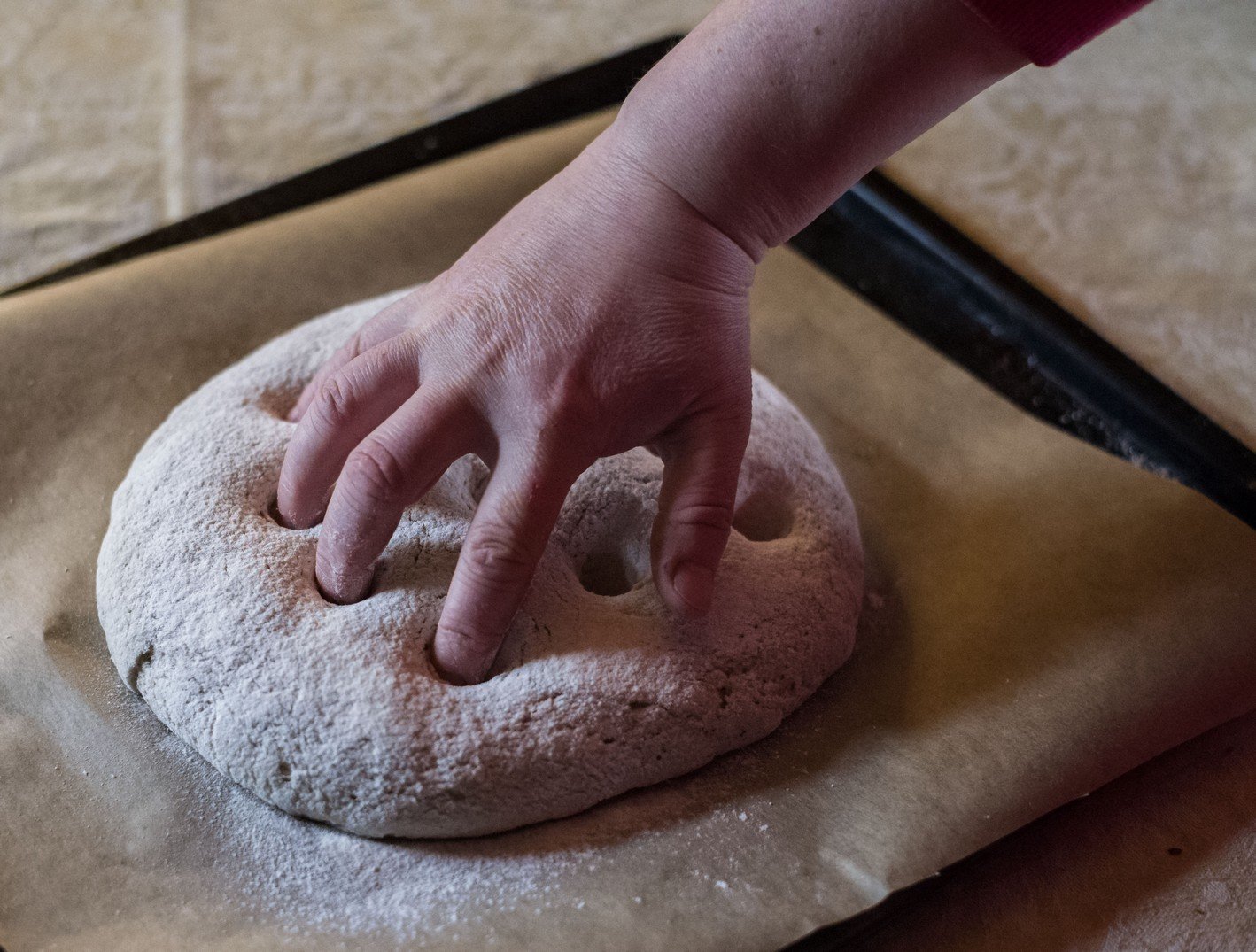 Tuo tarpu įkaitinkite orkaitę iki 250 laipsnių. Kepaliuką dėkite ant kepimo popieriumi padengtos skardos. Kadangi miežiniuose miltuose yra mažai glitimo, pamatysite, kad tešla labai skilinėja kai kyla, todėl elkitės su ja labai pagarbiai. Atsargiai delnu suplokite kepaliuką maždaug 5 cm storio papločiu, apibarstykite miltais ir pirštais perspauskite beveik iki apačios, taip kepant jis neišsipūs ir neatšoks pluta.